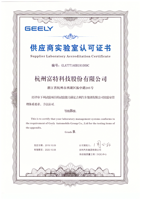 近期,富特科技顺利通过吉利汽车供应商实验室认可,并获得相关证书。