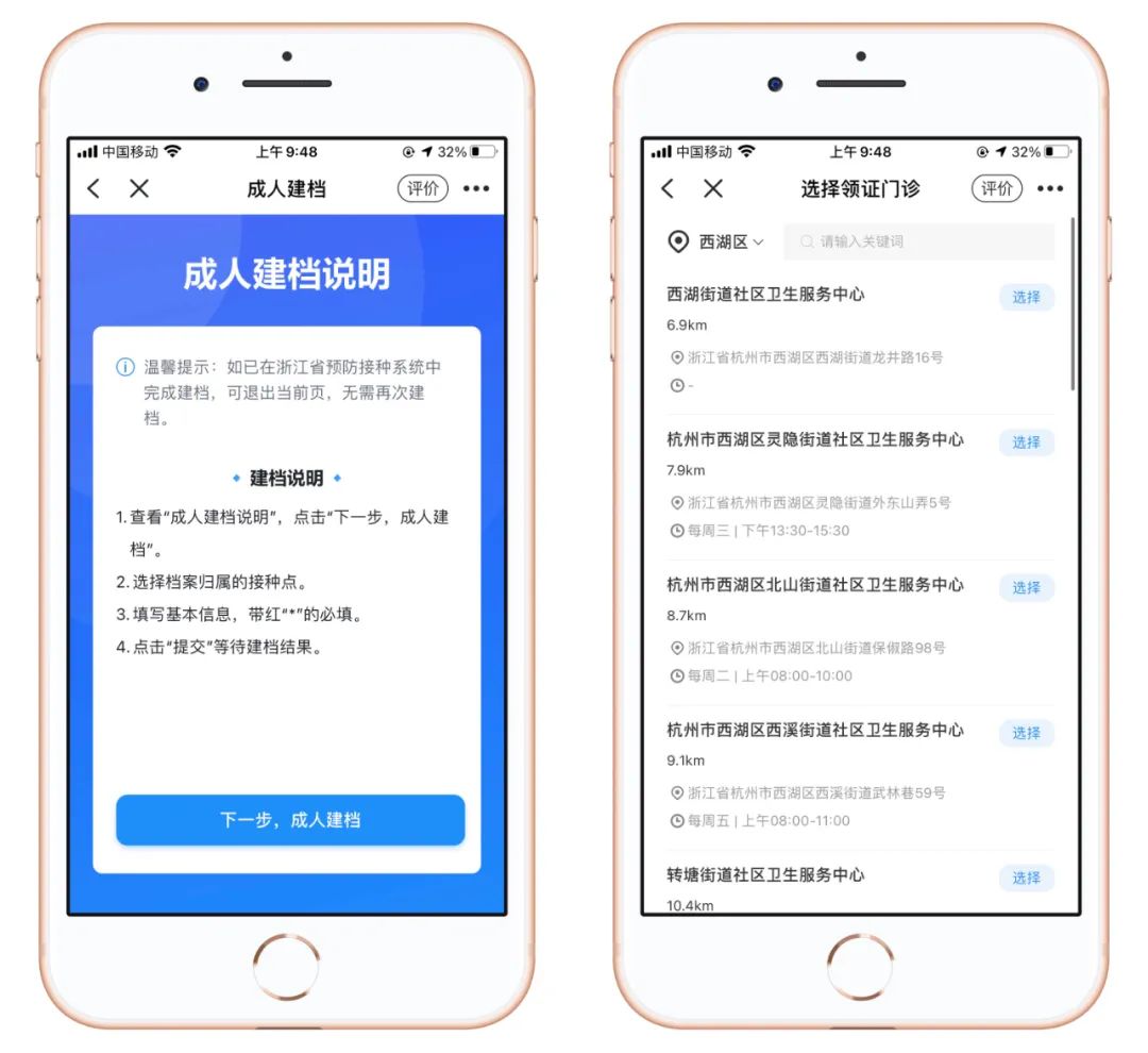 查看建档说明,选择领证门诊。(可在搜索栏输入对应接种证申领门诊名称进行关键词搜索)